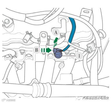 06 沿箭头A方向拉出插头卡销。沿箭头B方向按压插头,断开水温传感器插头。旋出水温传感器总成1。水温传感器拧紧力矩:(13±2)N·m。▼