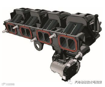 空气经过节气门体进入进气歧管,由于很小的障碍物都对气流产生阻碍,所以进气歧管需要内部光滑,有的车型采用复合材料使进气歧管内部更加光滑,保证尽量多的空气进入到气缸里面。进气歧管外形如下图所示。