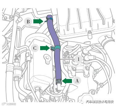 06 松开卡箍(箭头A、箭头C),旋出曲轴箱通风管支架固定螺栓(箭头B),取下曲轴箱通风管1。螺栓(箭头B)拧紧力矩:(10±2)N·m。▼