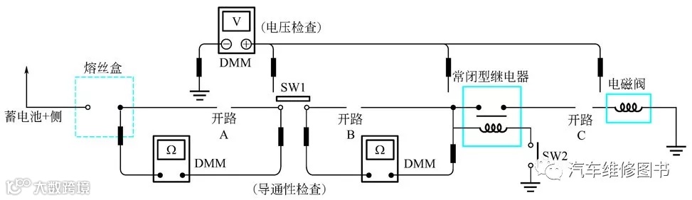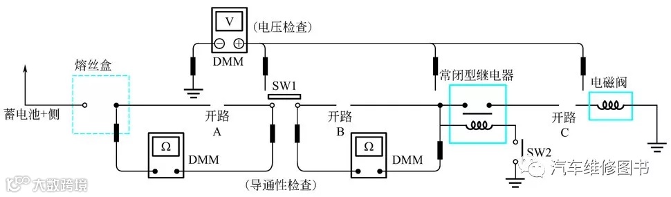 ③ 断开开关SW1,在开关SW1 处测量电压。有电压,开路在SW1 之后更远处;无电压,开路在熔丝盒和SW1 之间(点A)。