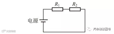 ■ 串联:若干个元件首尾相接在电路中,使电流只有一条通路,这种连接方式叫串联,如图电阻R1、R2 的串联电路。