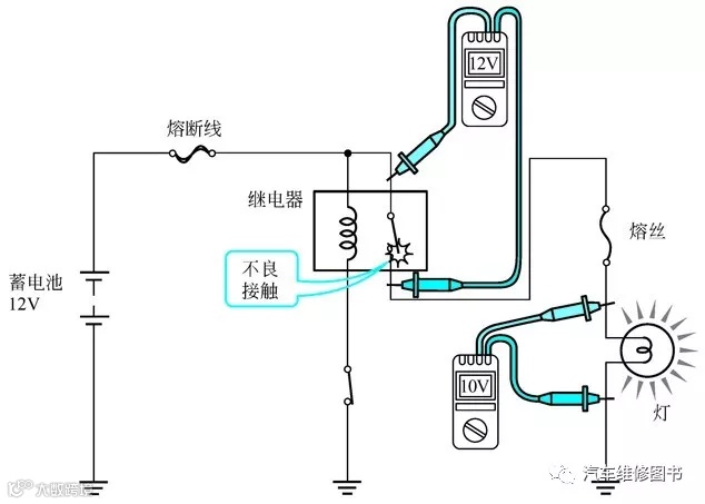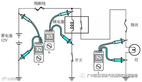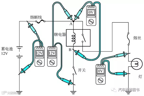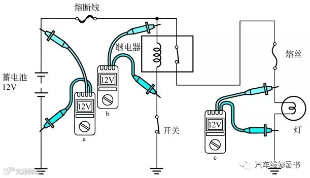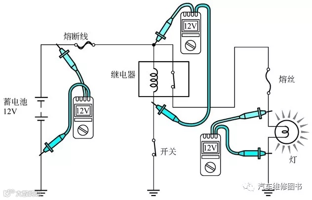 通常情况下,仅从外观观察很难发现电气系统内存在故障点,所以了解电路的电压以便发现故障是非常重要的。下面用几个万用表测量的示意图说明问题。