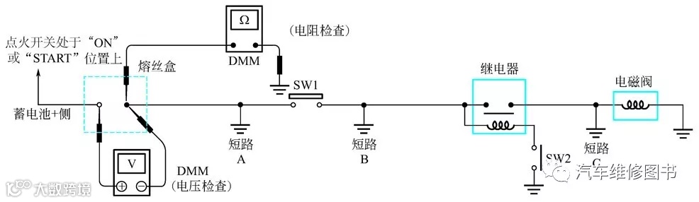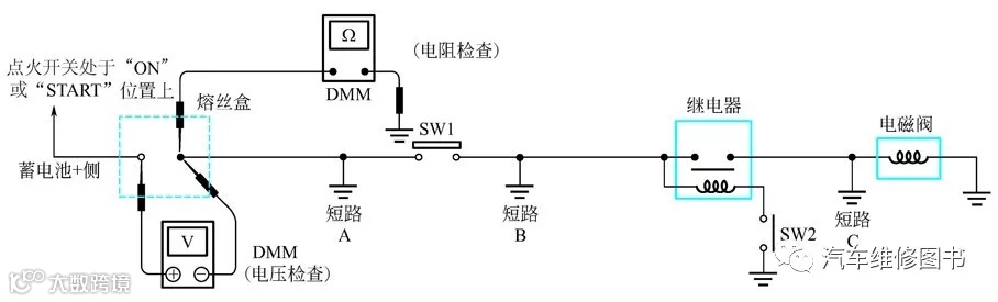 ③ 断开SW1,将万用表探针跨接在熔丝的两个端口上测量电压。有电压,短路在熔丝盒和SW1 之间(点A);无电压,短路在SW1 之后更远处。