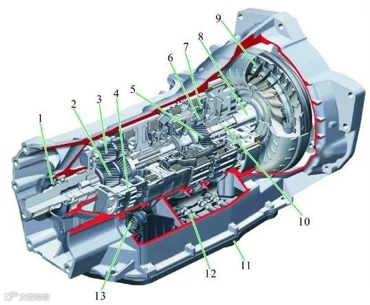 1— 输出法兰(至后驱动桥或分动器);2—次级行星齿轮组太阳轮;3—次级行星齿轮组行星齿轮;4—次级行星齿轮组齿圈;5—初级行星齿轮组太阳轮;6—初级行星齿轮组行星齿轮;7—初级行星齿轮组齿圈;8—ATF 泵;9—液力变矩器;10—变速器输入轴;11—油底壳;12— 自动变速器电液控制单元(阀体板、电磁阀等);13—变速器控制系统接线插口