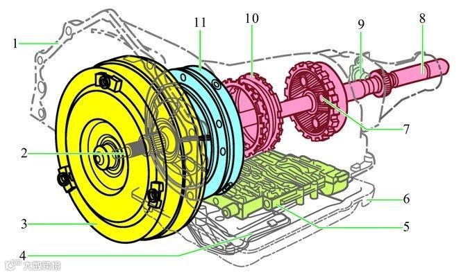 1—壳体;2—输入轴;3—液力变矩器;4—ATF 滤清器;5—电子液压控制系统;6—油底壳;7—行星齿轮组;8—输出轴;9—速度传感器;10—离合器;11—ATF 油泵