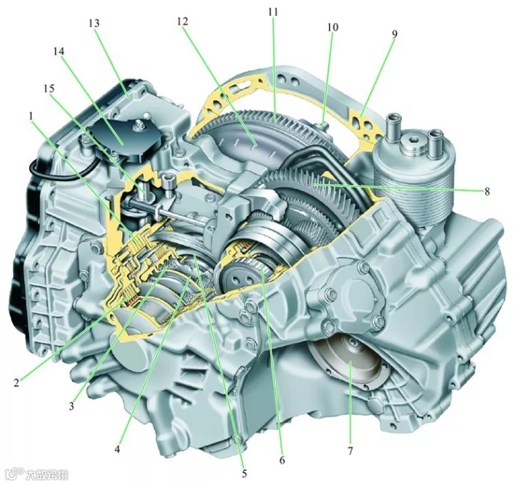 1—多片离合器;2—多片制动器;3—行星齿轮;4—太阳轮;5—齿圈;6—滚柱轴承;7—输出法兰(到前驱驱动桥);8—减速器斜齿齿轮;9—液力变矩器壳;10—变速器输入轴; 11—驱动齿圈;12—液力变矩器;13— 自动变速器换挡执行机构 安装位置(阀板、电磁阀等);14— 挡位开关(连接换挡手柄 和变速器内部选挡机构);15—选挡换挡轴
