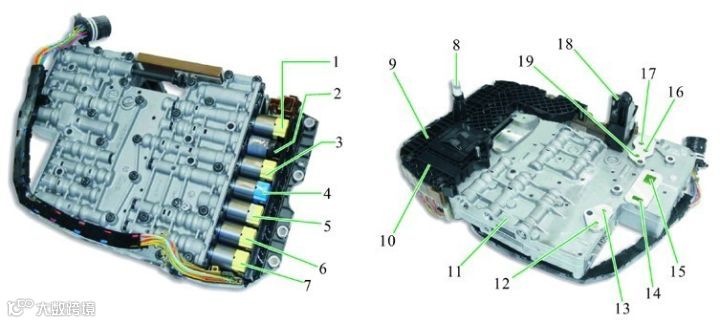 奥迪09L/0AT自动变速器阀体板如下图所示。两者均为6速自动变速器都和发动机依次纵向布置安装在四轮驱动的奥迪车上。