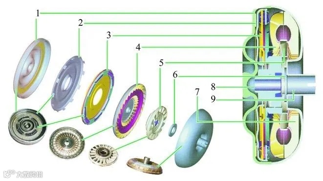 1—前盖;2—锁止离合器;3—减振器;4—涡轮;5—导轮;6—推力轴承;7—泵轮;8—输出轴;9—导轮轴