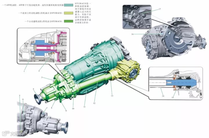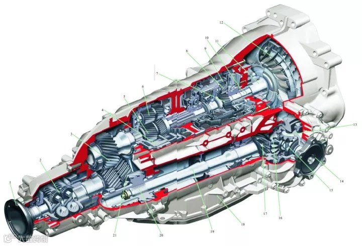 1—输出法兰(通往后驱动桥);2—自锁式中间差速器;3—初级传动斜齿齿轮;4—次级行星齿轮组齿圈;5—次级行星齿轮组太阳轮;6—次级行星齿轮组行星齿轮;7—初级行星齿轮组太阳轮;8—初级行星齿轮组行星齿轮;9—初级行星齿轮组齿圈;10—变速器输入轴; 11—ATF 泵;12—液力变矩器;13—前桥差速器行星齿轮;14—输出法兰(至前驱动桥); 15—前桥驱动器半轴齿轮;16—主减速器齿轮;17—传动轴斜齿齿轮;18—自动变速器电液控制组件;19—传动轴;20—传动轴前桥直齿小齿轮安装花键;21—前桥直齿小齿轮(带有斜面体齿)