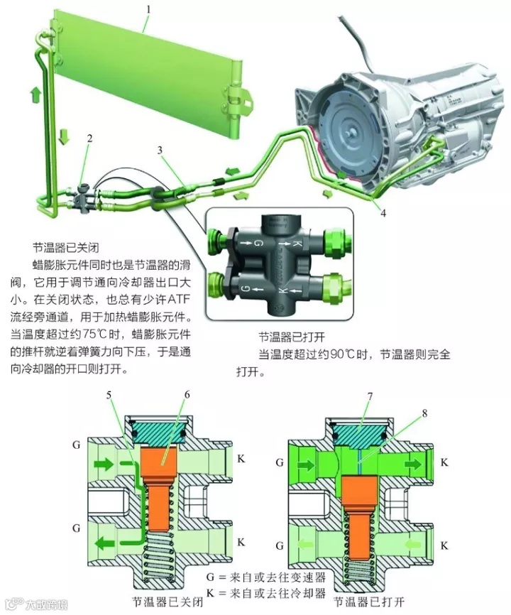 1—ATF 冷却器;2—机油温度调节器(节温器);3—ATF 冷却器供液管;4—ATF 冷却器回液管;5—旁通道;6—蜡膨胀元件;7—堵塞;8—推杆
