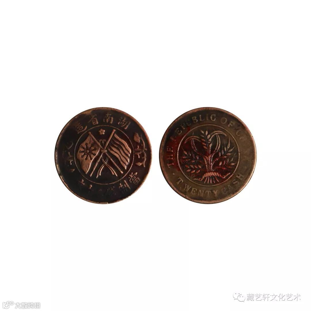 双旗币:此枚湖南省造双旗币当制钱二十文,正面面图案中央为两面交叉的国旗,上方为 “湖南省造” 4 字,下面为币值当制钱二十文;背面珠圈内图案为稻穗组成的嘉禾纹,上下边缘环英文。此币工艺精湛,钱文清晰,字体深邃。经过悠久的历史下依然保存完好,上面的锈迹也见证了其历史的沉淀,具有非常明显的历史过渡性特征,有着难以言喻的收藏价值。