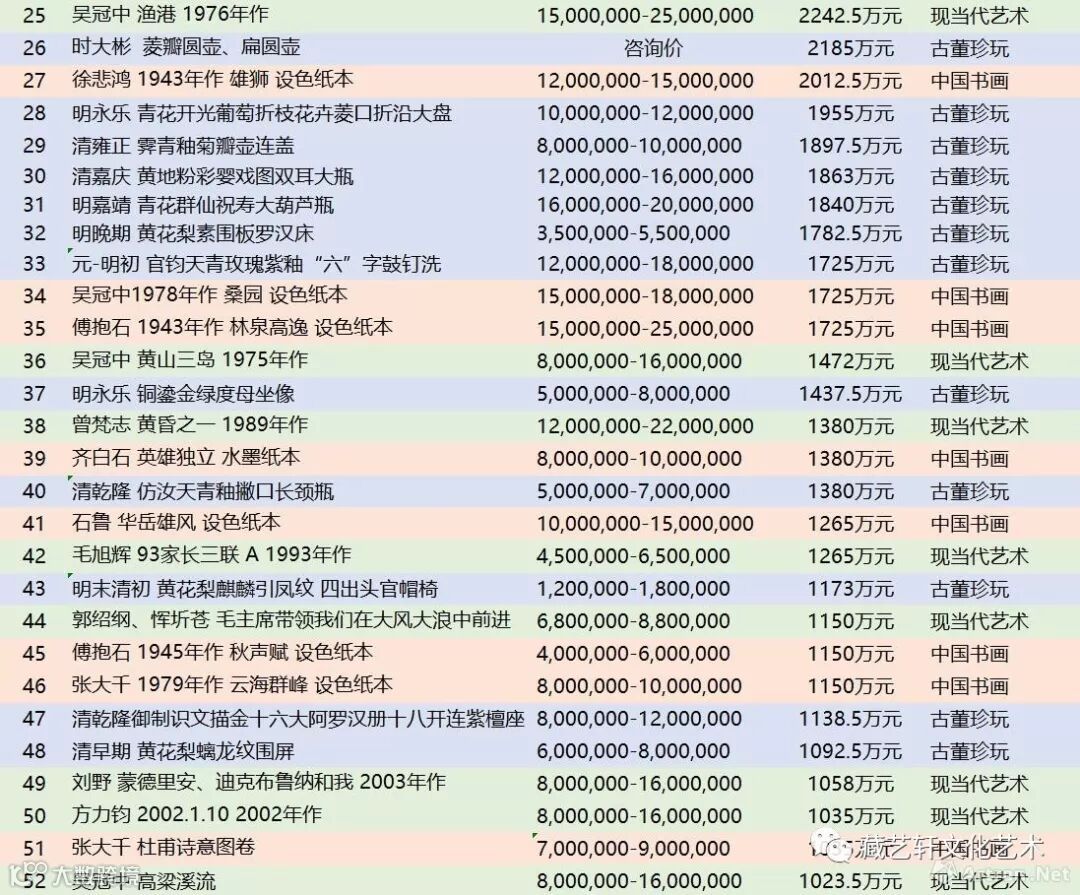 中国书画:22件;现当代艺术:11件;古董:19件