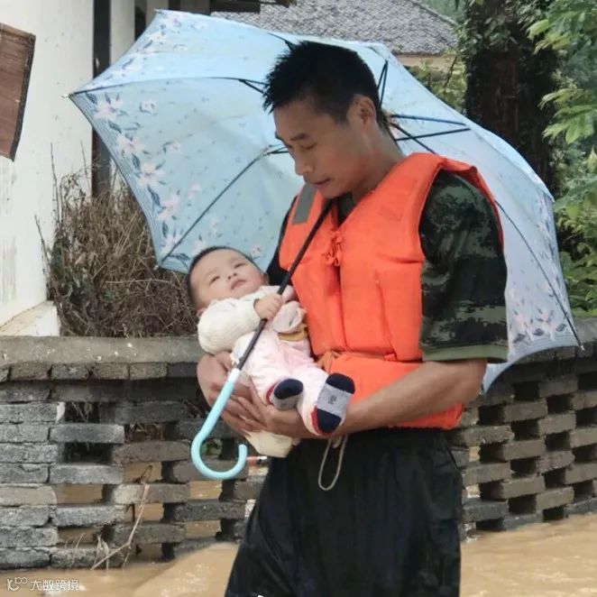 被护在怀中的宝宝紧紧抓住雨伞,