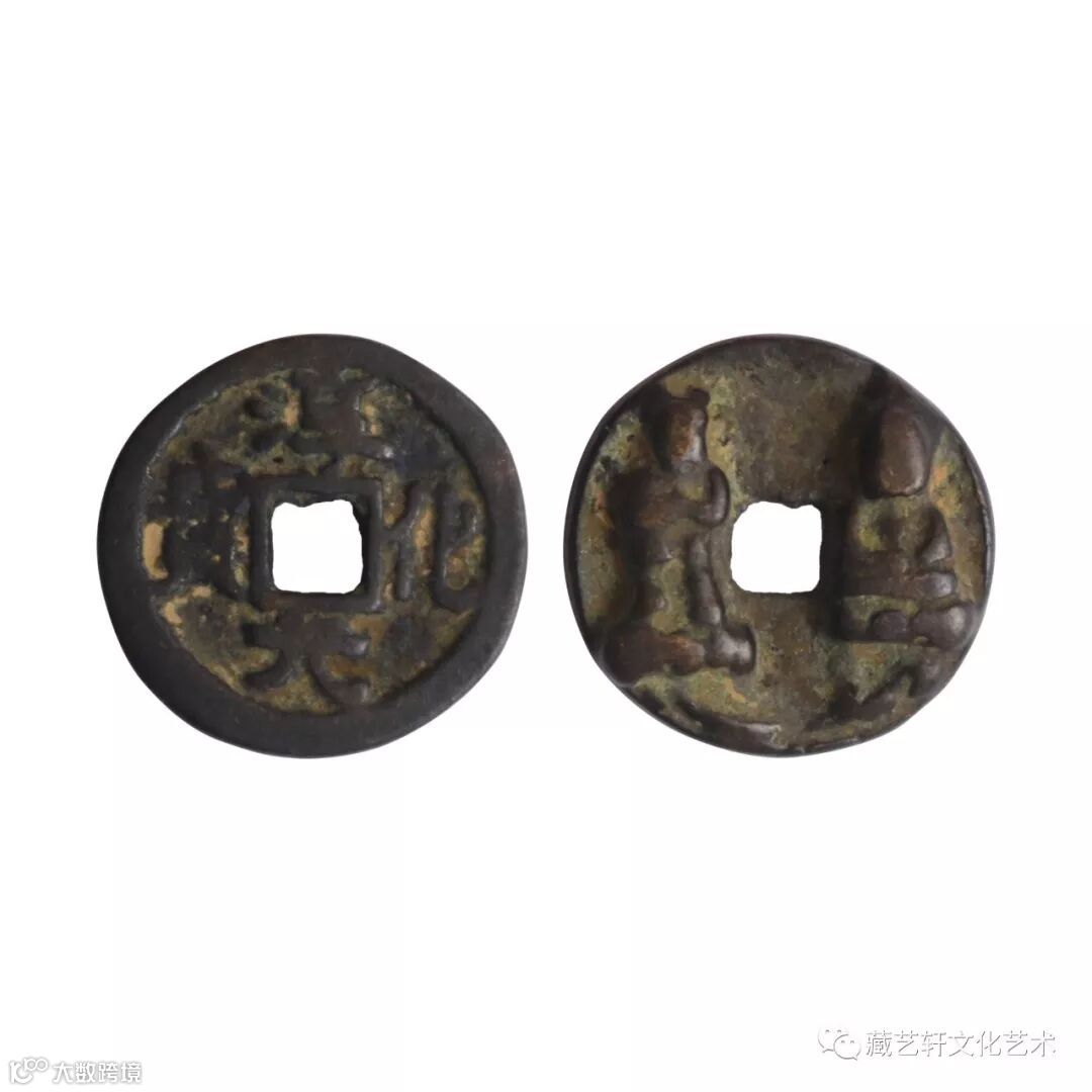 This Chunhua Yuanbao is old and natural, with round pulp. The front of the coin is inscribed with the words "Chunhua Yuanbao". Its font is meaningful, free and easy, beautiful and extraordinary. It is the imperial book of Taizong in Song Dynasty. On the back of the coin is the image of "the boy worshiping Guanyin". On the left is the boy of good fortune standing on the lotus petal pedestal with his hair knotted on his head, his hands closed, his face naive and lively, and his body slightly to the right. On the right is the Guanyin Bodhisattva, who is holding the lotus flower and is shackled on the throne of the eight-leaf lotus flower. The auspicious clouds are twining under the throne. Both Buddhas have lotus thrones and auspicious clouds, which fully highlights the importance of Buddhism in the Song Dynasty, and the belief in Buddhism has existed since ancient times. The statues are free, smooth, natural, clear and solemn, and lifelike. We can see the level of metal sculpture technology at that time.