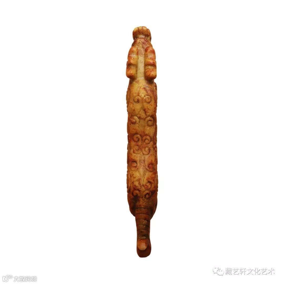 藏品用料更是高贵的高古玉,高古玉多为帝王皇家达官贵人用玉,从用料、制作工艺、文化气息上都有着厚重深奥的内涵。因此除了欣赏古人的琢玉技艺、品味高古玉中神韵飞扬的历史文化内涵以外,把玩一块高古玉,就像品读着年代久远的历史的传奇,手中古玉演绎的人间故事隐约可观,古意融融,人玉灵通,把玩者的心境是不可以用语言表述的。此件藏品价值不菲,琢制技艺十分精湛,无论是浅浮雕、透雕,还是阴线刻画,均拙朴细精。