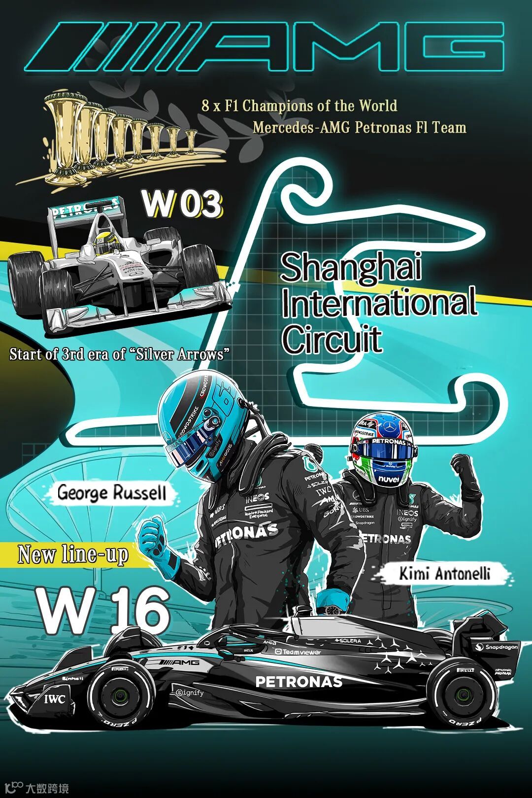 本周末,F1大奖赛移师上海国际赛车场。梅赛德斯-AMG F1马石油车队缔造的第三次“银箭时代”的王朝,正是由在上赛所取得的回归后的第一个分站赛冠军预告了开始。2025年,AMG F1车队带来了新赛车W 16 E PERFORMANCE,以及由拉塞尔搭档新秀安东内利的新阵容,以新面貌开启了新赛季的新征程。