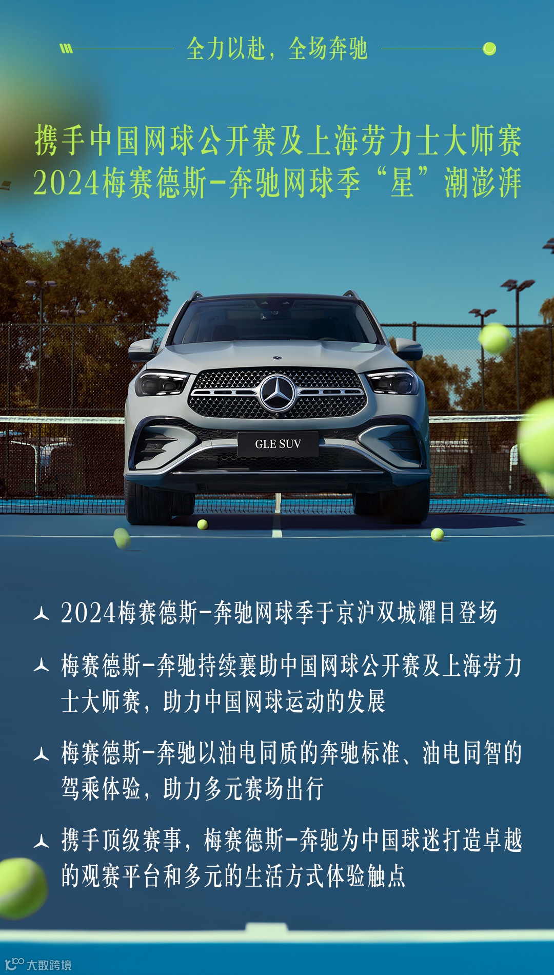 自上世纪90年代以来,梅赛德斯-奔驰始终致力于在全球范围内推动网球运动的发展,包括与中国网球公开赛与上海大师赛持续十多年的合作。2024梅赛德斯-奔驰网球季以“全力以赴,全场奔驰”为主题,见证全球顶级名将汇集京沪,为球迷在家门口奉上国际级的网球赛场盛事,让更多人感受到竞技体育令人心潮澎湃的魅力。