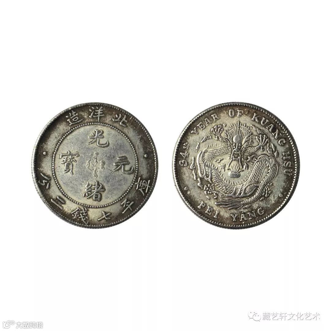 清朝末年,朝野上下发生了银元单位之争,币制未统一。北洋机器局更名北洋造币局,铸行较早脱离“两单位”的银币后,又于光绪二十五年始,铸行面值库平纪重的“光绪元宝”,在这类币的背面左側阿拉伯数字表示该币为光绪X年版,北洋造34年光绪元宝库平七钱二分发行量少,市场稀缺,为稀有币种。