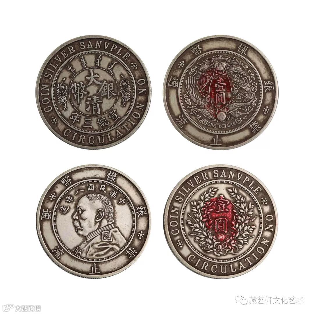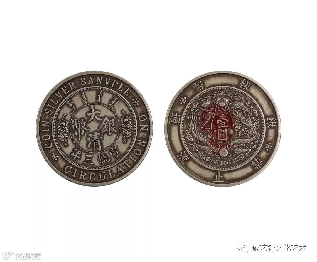 “大清银币宣统三年(样版币)”,此样版币为机模卡出来。宣统皇帝在位比较短,发行的钱币比较少,因此此币稀少罕见,极为珍贵。直径比一般的宣统三年钱币大,为币中币样式。钱币正面最外圈铸有“银样币 禁止流通”字样,钱背同样位置有英文对应。正面内圈一般宣统三年无异,中心珠圈内铸“大清银币”四字,左右两边分别铸有长枝菊花纹饰,上下缘为满汉文“宣统三年”字样。