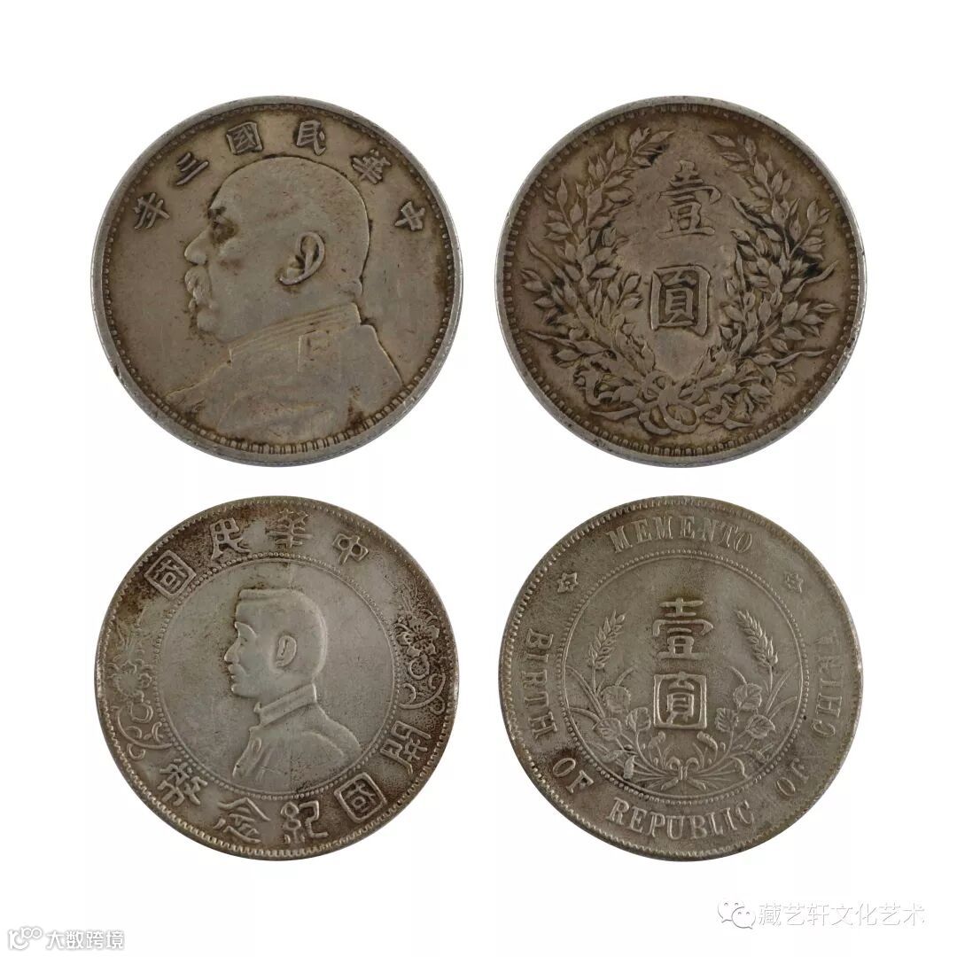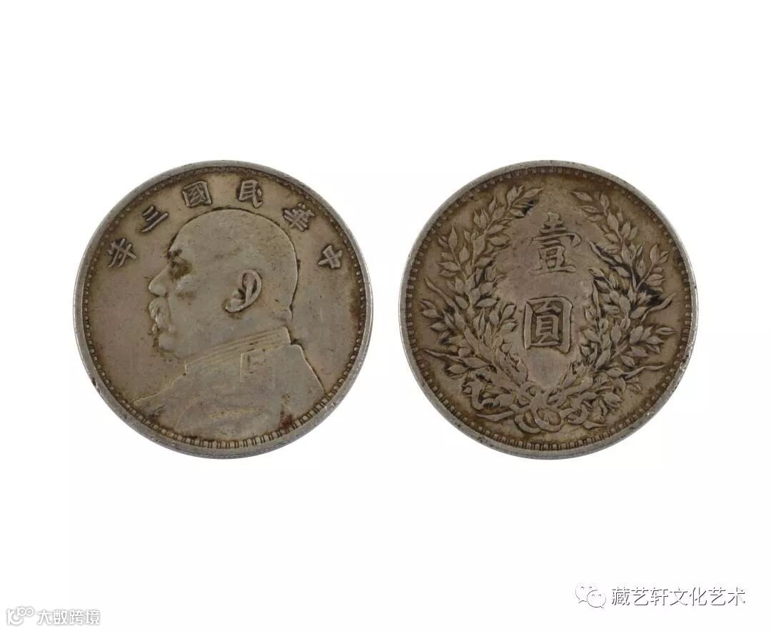 中华民国三年袁大头壹圆:藏品正面为袁世凯五分侧面像,上列“中华民国三年”六字,“民”字中有一“点”;背面中间竖写汉字“壹圆”,周围环嘉禾纹饰,下系结带。整币设计优雅,十分精美,其色泽光鲜,自然包浆,纹饰深浅适度,边缘线条粗细均匀,间距也疏密一致。人像、发丝、胡须、穗芒等细微之处清晰有度,生动自然,有很高的艺术观赏价值和文物价值,具有不错的保值和升值功能。