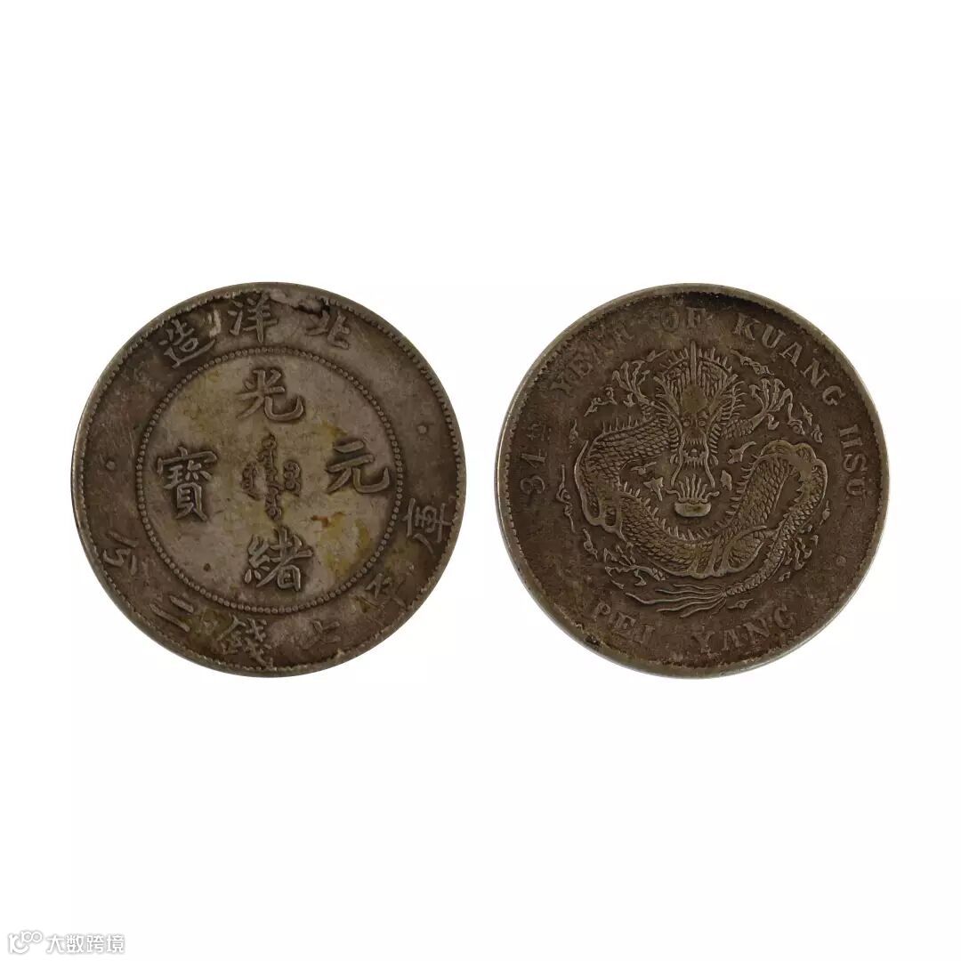 光绪元宝:此币为北洋造光绪元宝,上缘书:“北洋造”,下缘书:“库平七钱二分”,钱背蟠龙图案,龙爪张扬,神武有力;龙身盘踞,龙鳞雕刻细密有致,腾云驾雾,身姿遒劲有力。该钱币工艺精湛,雕工完美,浮雕感极其强烈的品种,镜面平整光滑,纹饰清晰,具有较高的收藏价值。