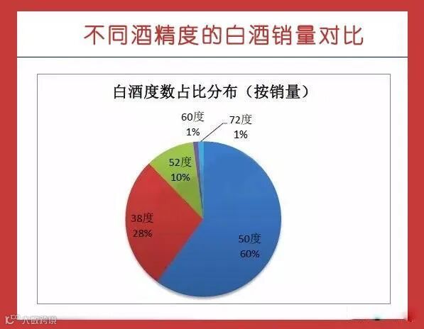 白酒是三种酒里酒精度最高的,现在市场上的白酒度数一般有:一般在35%~65%之间,其中38%、45%、52% 是最常见的白酒度数。像60%以上的高度白酒很少,一般在北方,如东北的烧刀子和闷倒驴。
