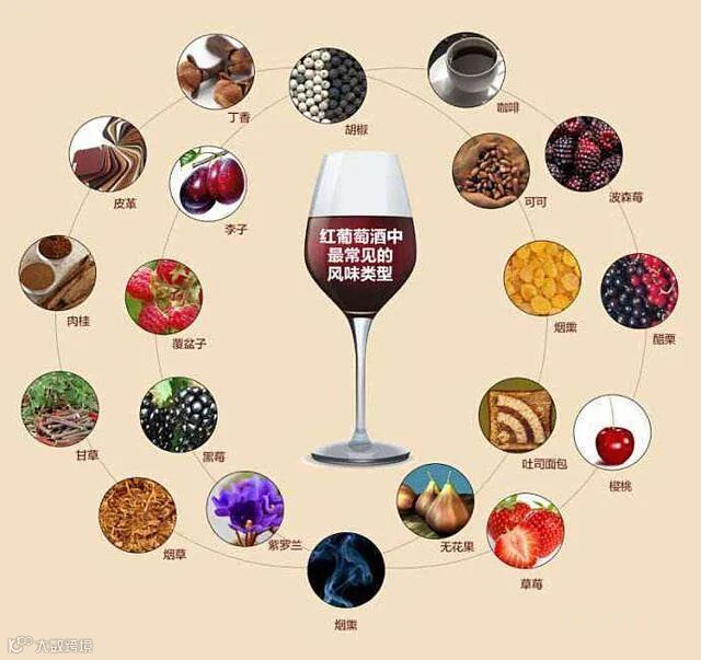 不同类型的葡萄酒口感差异大,单宁高的葡萄酒带有酸涩味,和橡木桶的味道,口感层次丰富;新世界葡萄酒一般带有柑橘、丁香、肉桂等果香味;像贵腐酒这样的甜型葡萄酒酸甜适口,更像饮料的味道。