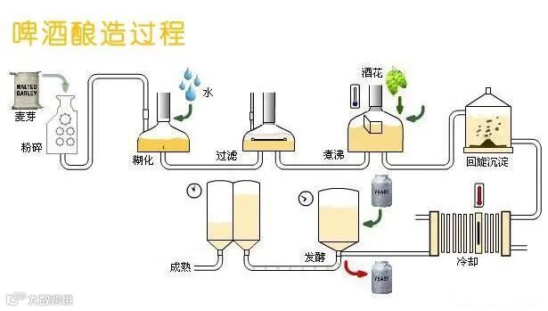 啤酒属于发酵酒,生产分三个步骤,先制造麦芽(将粉碎的麦芽加水和酒花还有糖进行蒸煮过滤),再进行糖化,最后发酵7~21天即可。