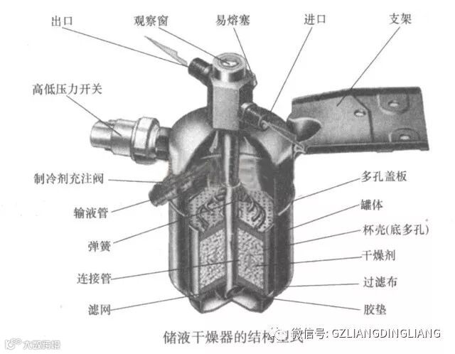 大部分储液干燥器都是一个密封焊死的金属瓶,不可拆卸,里面放有干燥剂、过滤网,装在冷凝器和膨胀阀之间。