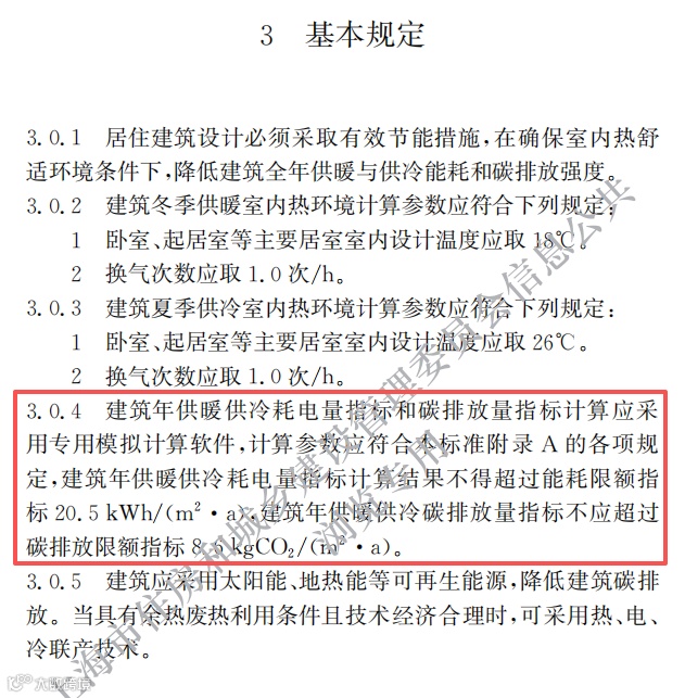 本市新建民用建筑应严格执行国家和本市建筑节能设计规范,居住建筑年供暖供冷耗电量指标计算结果不得超过能耗限额指标20.5kWh/ (m2·a),建筑年供暖供冷碳排放量指标不应超过碳排放限额指标8. 6kgCO2/ (m2·a)。
