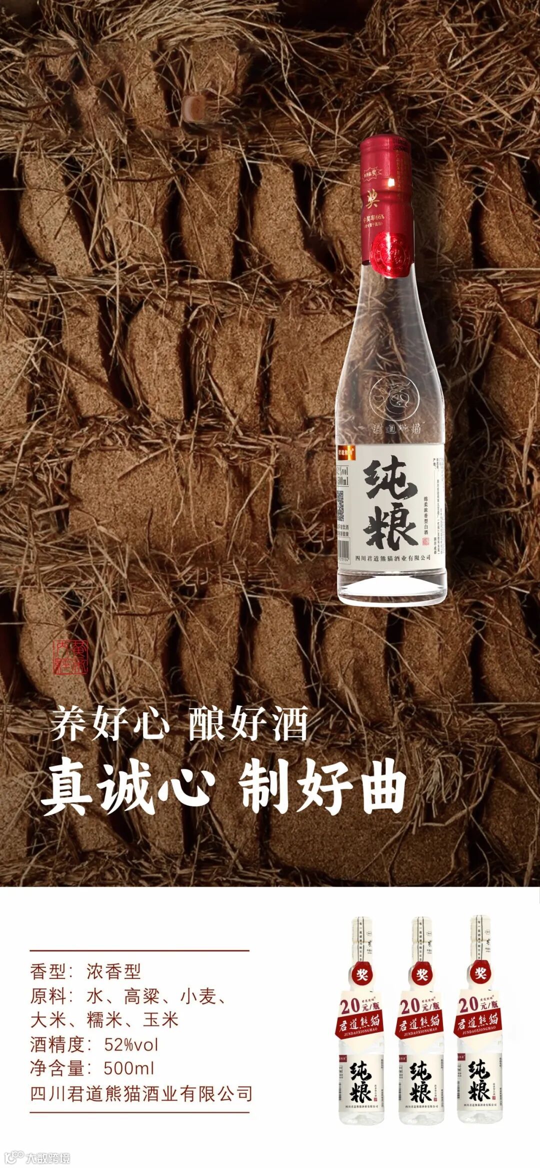 扎根四川崇州黄金酿酒带,君道熊猫酒严选优质高粱、小麦、大米、糯米、玉米五种粮食。其中北纬 30° 的红缨子高粱粒小皮厚,淀粉含量超 60%,为酒体注入醇厚骨架;冬小麦制曲则激发丰富风味物质,成就 “三斤粮食一斤酒” 的凝练匠心。
