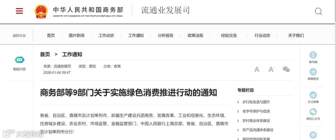 近日,商务部等9部门联合发布《关于实施绿色消费推进行动的通知》(以下简称《通知》),对“十五五”时期绿色消费工作作出安排。《通知》聚焦民生保障领域优质供给,支持设立绿色农产品销售专区,展示质量认证标识、可追溯标识及药残检测结果;鼓励购买获得绿色产品认证的绿色智能家电产品、无氟空调等;完善家电能效水效相关标准,推进绿色智能家电产品认证体系建设。《通知》提出夯实绿色消费基础,鼓励开展绿色认证,培育绿色经营主体;推动我国绿色消费领域重点标准与国际接轨,加强标准和合格评定领域交流合作。