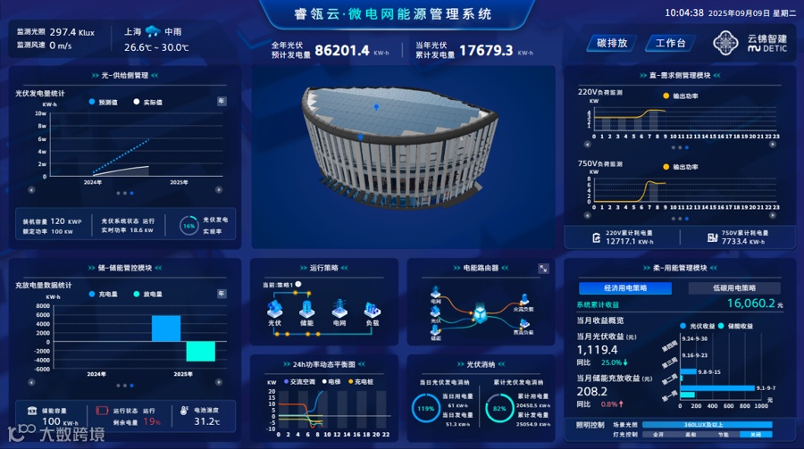 基于BIM底座的“睿瓴云”数字能源管理平台,是贝壳楼的“柔性调度师”。它通过监测零碳楼所有设备用能数据、预测未来用电高峰、控制用能设备运行,从而实现柔性调度,确保让每一度绿电都用在“刀刃上”,实现用能成本最优和绿电收益最大化。