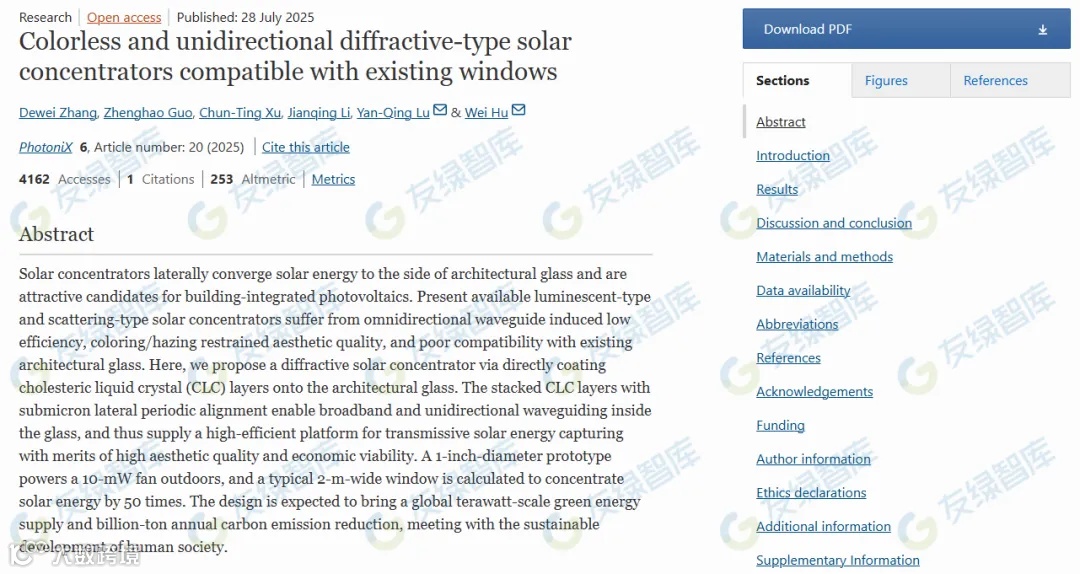 近日,PhotoniX 报道了南京大学胡伟教授、陆延青教授团队的研究进展,相关工作“Colorless and unidirectional diffractive-type solar concentrators compatible with existing windows.”PhotoniX 6, 20 (2025)解决了现有聚光器在色偏、雾度及集成度等方面所遇到的挑战。