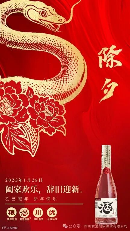 亲爱的朋友们,除夕夜,团圆时,君道熊猫酒与您共庆佳节。愿这杯香醇的熊猫酒,伴您辞旧迎新,带来一年的好运与幸福。举杯邀明月,共饮此良宵,愿您和家人团团圆圆,幸福