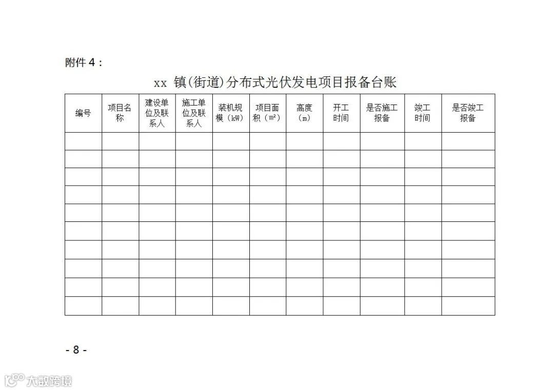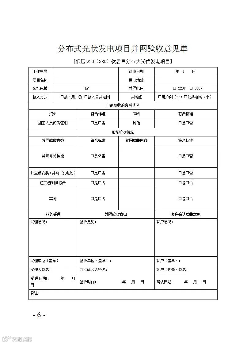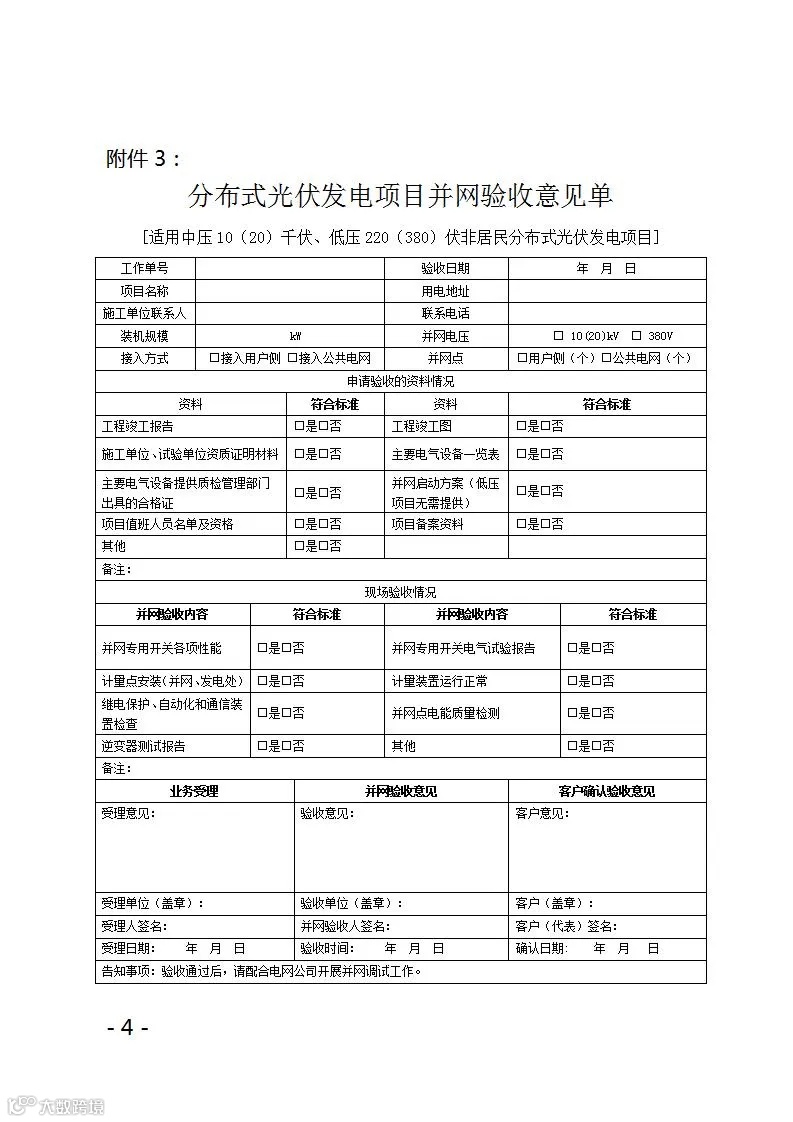 (三)验收。分布式光伏发电项目完工后,由项目建设单位组织设计、施工、监理、调试运行等相关单位,依法依规完成验收手续,向所属镇政府(街道办、园区管委会)提交《新会区分布式光伏发电项目(建筑部分)工程竣工报备表》(附件2)进行竣工报备。完成竣工报备后,可按程序向属地供电所申请办理并网验收。属地供电所按照《分布式光伏发电并网验收意见单》进行并网验收(附件3)。未办理竣工报备的,供电部门不予办理并网验收。镇政府(街道办、园区管委会)要形成《分布式光伏发电项目报备台账》(附件4),加强对分布式光伏发电项目施工报备、检查和竣工监管。