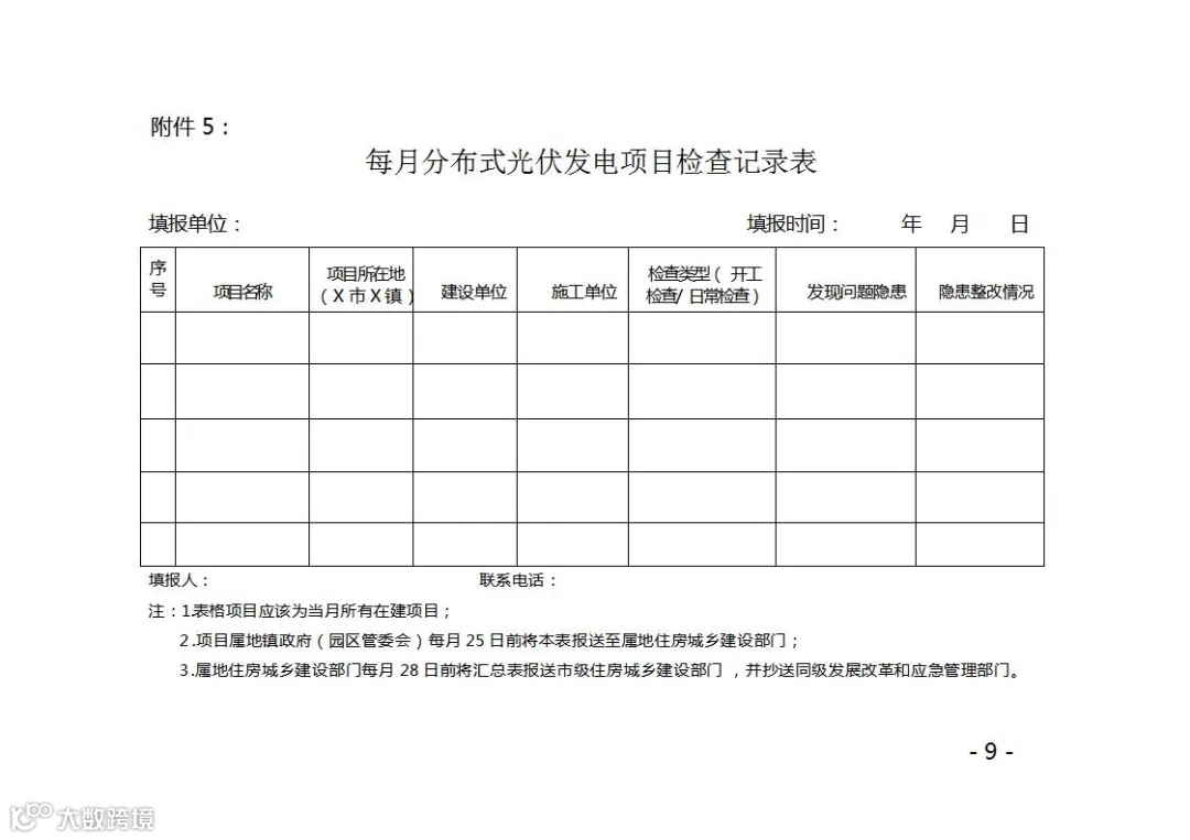 (一)健全完善监管机制。分布式光伏发电项目由镇政府(街道办、园区管委会)负责施工安全监管,区发展改革、住房城乡建设、应急管理、自然资源和城市管理综合执法等部门按职能指导项目镇政府(街道办、园区管委会)开展分布式光伏发电项目施工安全监管相关工作。镇政府(街道办、园区管委会)应加强日常施工安全检查,在项目开工前现场核查项目开工条件。每月25日前报送《每月分布式光伏发电项目检查记录表》(附件5)至区住房城乡建设局。区住房城乡建设局收集汇总各镇政府(街道办、园区管委会)报表数据,每月28日前报送市住房城乡建设局,并抄送区发展改革局和区应急管理局。