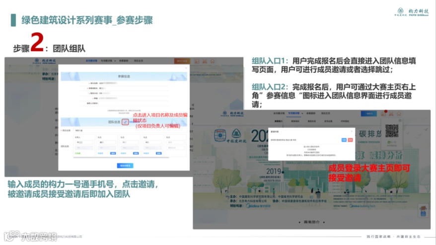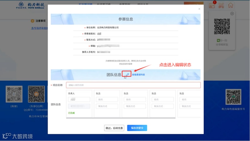 报名填写信息后,即可进入团队信息填写界面,在这里您可以选择“跳过”,选择单独参赛;也可以在该页面邀请您想合作的朋友一起参赛。需注意:被邀请人手机号必须已注册构力一号通才可进行邀请,若您的小伙伴还未注册账号,点击大赛主页链接即可跳转至一号通注册界面完成注册。