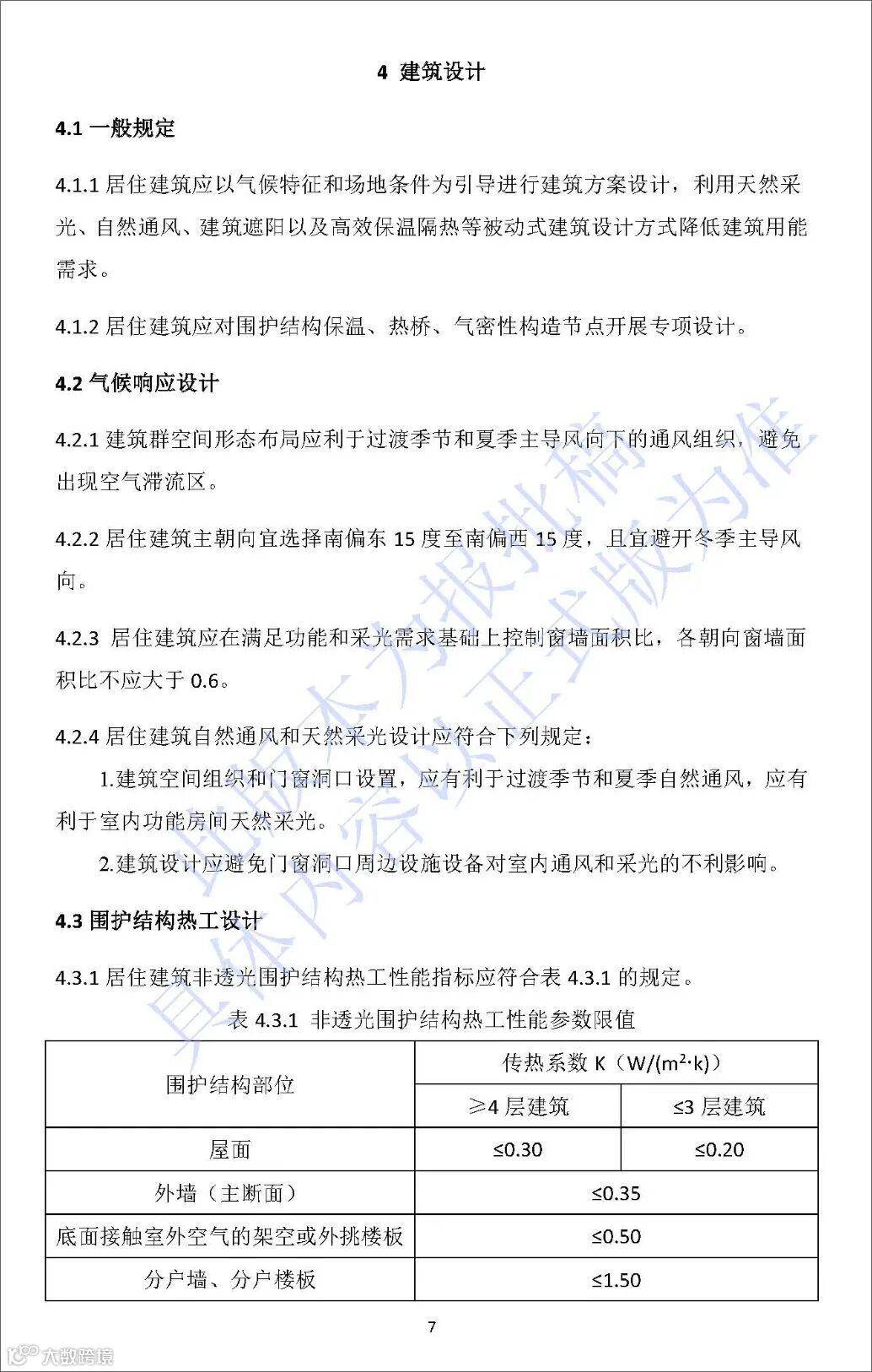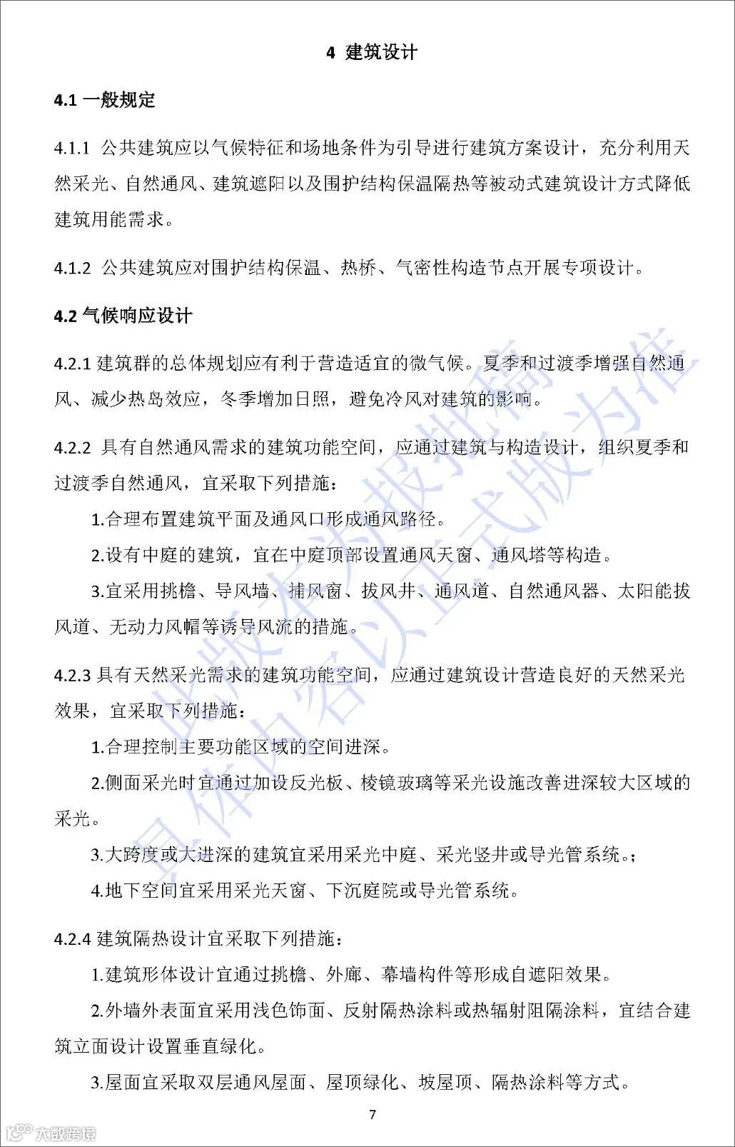 2、引导气候响应设计措施。响应地域气候特点,强调被动式设计优先的理念。设立窗墙比限值,居住建筑不超过0.6,公共建筑不超过0.7;将自然采光、自然通风纳入超低能耗建筑约束性指标体系。