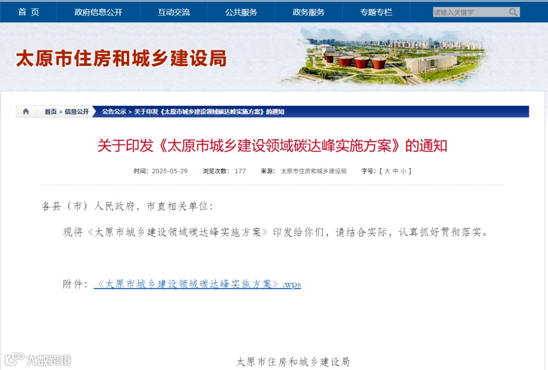5月29日,太原市住房和城乡建设局关于印发《太原市城乡建设领域碳达峰实施方案》的通知。