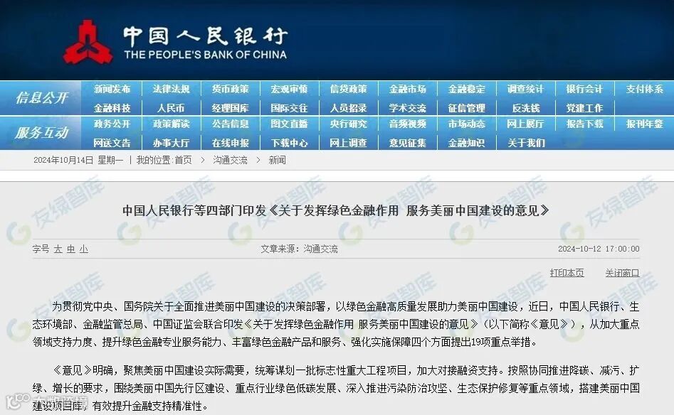 中国人民银行等四部门印发《关于发挥绿色金融作用 服务美丽中国建设的意见》