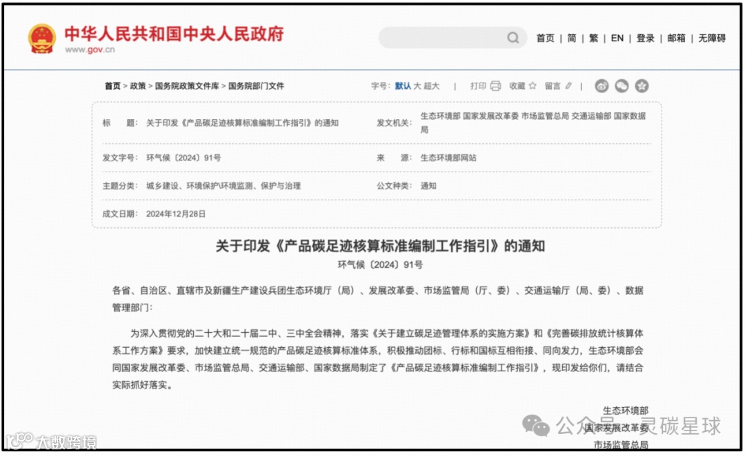 2024年9月,生态环境部发布了《温室气体 产品碳足迹 量化要求和指南》;