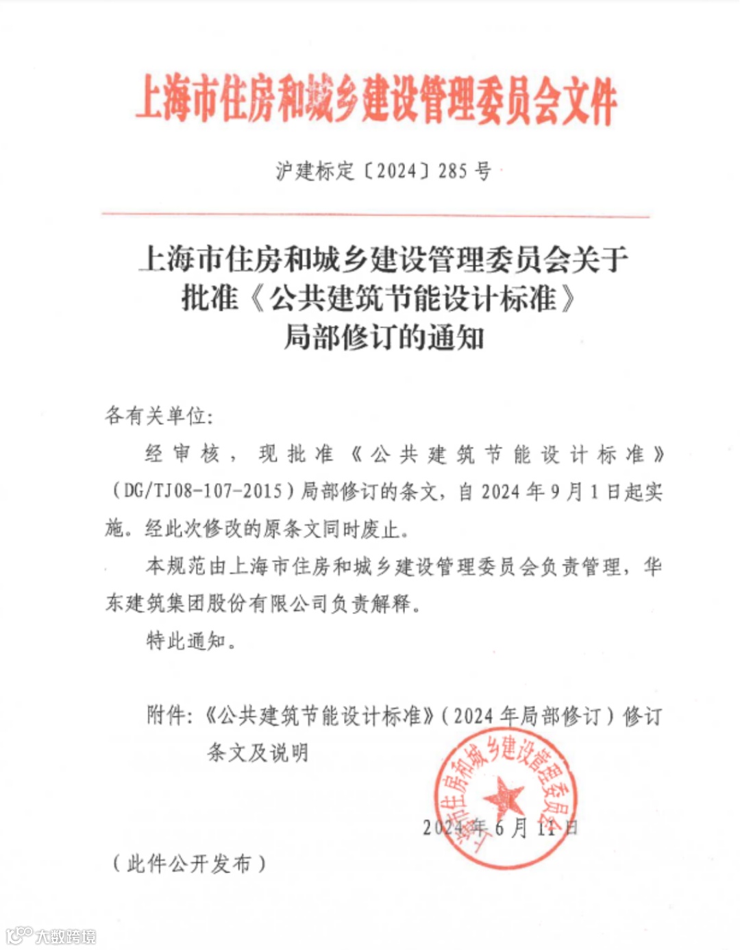 经审核,现批准《公共建筑节能设计标准》(DG/TJ08-107-2015)局部修订的条文,自2024年9月1日起实施。经此次修改的原条文同时废止。