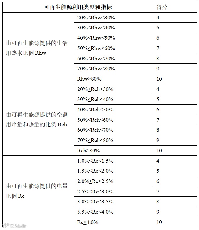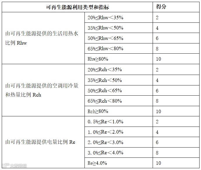 公共建筑:5.2.18 利用可再生能源提供生活热水,其热水供应量满足建筑生活热水总消耗量的比例不低于10%,或采用可再生能源发电量技术,其发电量在建筑总用电量中的达到的比例不低于2%,或采用地源、水源等新型热泵空调技术(未提定量要求,直接判定得分)。