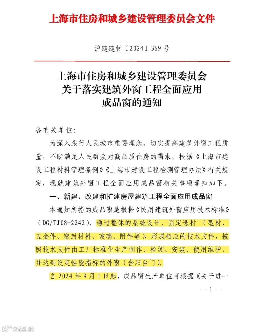 上海市住建委发布文件,要求自 2024 年 9 月 1 日起,新建、改建、扩建房屋建筑工程全面应用成品窗。
