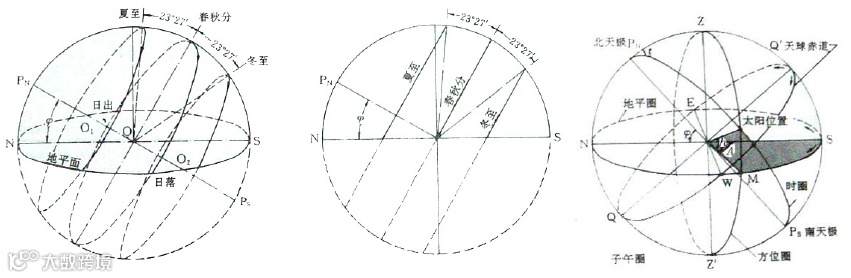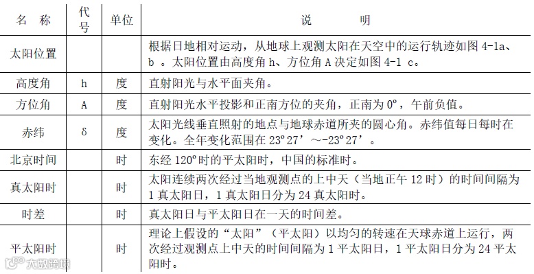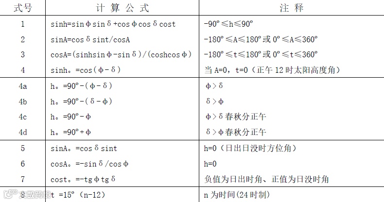 太阳位置由高度角和方位角确定,太阳位置计算采用真太阳时,图(1)为太阳位置计算公式,图(2)为公式中的术语与代号,图(3)为太阳在天球上的运行轨迹和位置。