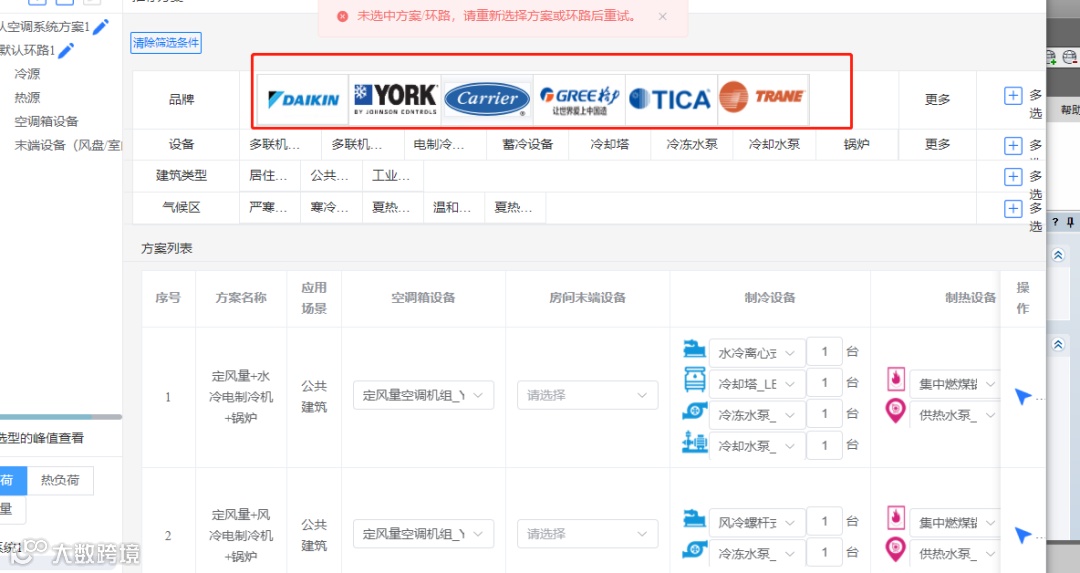 支持空调设备及提供系统方案,并按照设备厂商、方案场景和性能参数等进行分类!