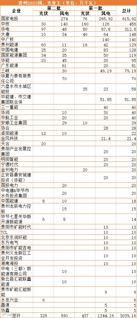 4月23日,贵州省能源局下发《贵州省2023年度风电光伏发电建设规模项目计划(第二批)的通知》,规模总计12.58GW,其中光伏3.28GW、风电9.3GW。叠加此前下发的第一批17.8116GW风、光项目来看,贵州省2023年已经下发30.4GW。(《贵州17.8GW首批风光清单:国家电投、中核、华电、中广核、大唐均超1GW》)
