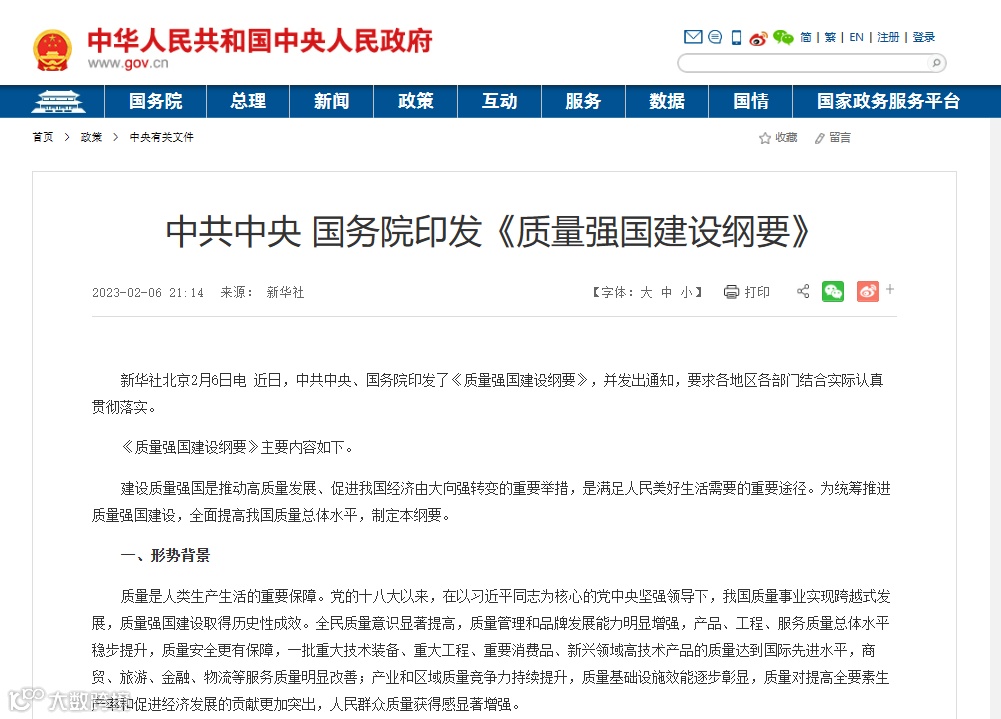 近日,中共中央、国务院印发了《质量强国建设纲要》,并发出通知,要求各地区各部门结合实际认真贯彻落实。