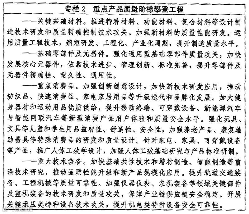 (六)强化产业基础质量支撑。聚焦产业基础质量短板,分行业实施产业基础质量提升工程,加强重点领域产业基础质量攻关,实现工程化突破和产业化应用。开展材料质量提升关键共性技术研发和应用验证,提高材料质量稳定性、一致性、适用性水平。改进基础零部件与元器件性能指标,提升可靠性、耐久性、先进性。推进基础制造工艺与质量管理、数字智能、网络技术深度融合,提高生产制造敏捷度和精益性。支持通用基础软件、工业软件、平台软件、应用软件工程化开发,实现工业质量分析与控制软件关键技术突破。加强技术创新、标准研制、计量测试、合格评定、知识产权、工业数据等产业技术基础能力建设,加快产业基础高级化进程。